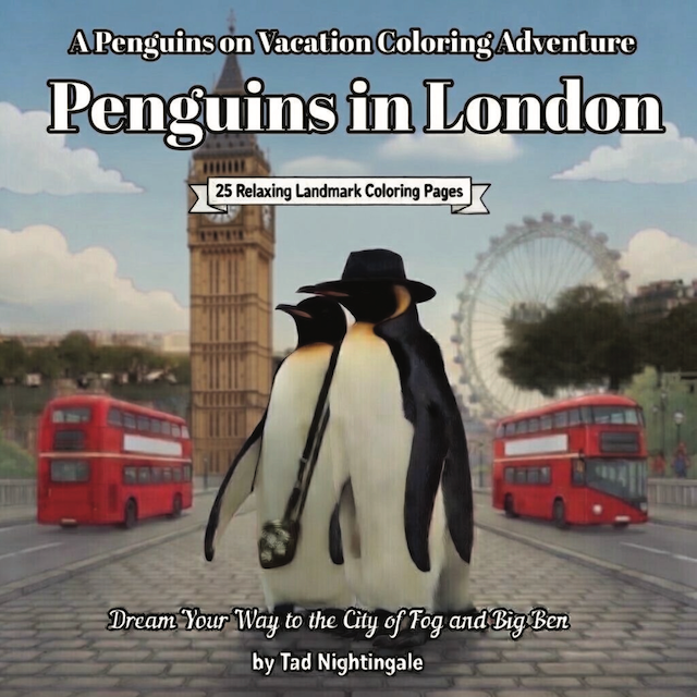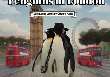 Join Poppy and Penny on a whimsical trip to foggy London town! Watch as the stylish penguins pose in front of Big Ben, ride the London Eye, stroll across Tower Bridge, and enjoy classic red buses. This 25-page coloring book brings the charm of England to life with intricate line art that’s ideal for all ages and perfect for relaxing evenings.