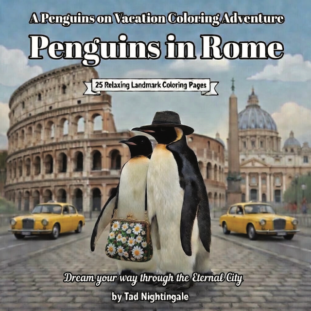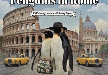 Venture into the Eternal City with Poppy and Penny Penguin! This enchanting coloring book takes you through ancient Rome — from the majestic Colosseum and Spanish Steps to the Trevi Fountain and stunning Vatican views. With 25 beautifully detailed, single-sided pages, you’ll bring the romance and history of Italy to life while enjoying a peaceful, creative getaway.